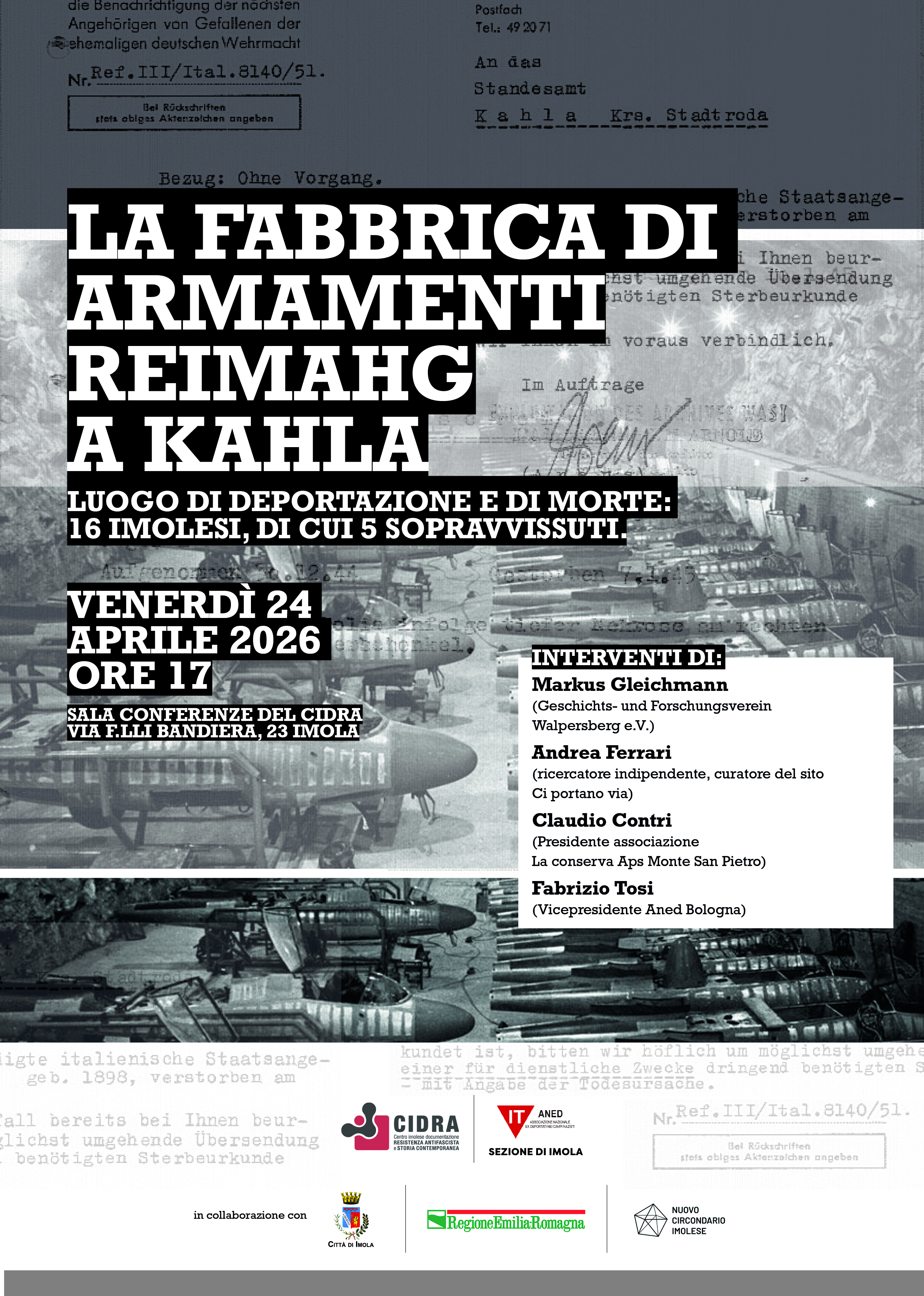 Venerdì 24 aprile 2026 alle 17 nella Sala Conferenze del Cidra in via F.lli Bandiera, 23 ad Imola avrà luogo un approfondimento sul campo di lavoro di Kahla che ha così violentemente interessato il nostro territorio: 16 uomini dell’imolese sono stati inviati al lavoro nella fabbrica di armamenti Reimahg e solo 5 di essi riuscirono a sopravvivere. Ne parleremo con ospiti competenti: Markus Gleichmann (presidente dell’associazione sulla storia del Walpersberg), Andrea Ferrari ricercatore indipendente e curatore del sito Ci portano via, Claudio Contri presidente associazione La conserva aps Monte San Pietro e Fabrizio Tosi vicepresidente dell’Aned Bologna che da anni si occupa di ricostruire le vicende degli internati militari della città metropolitana di Bologna.